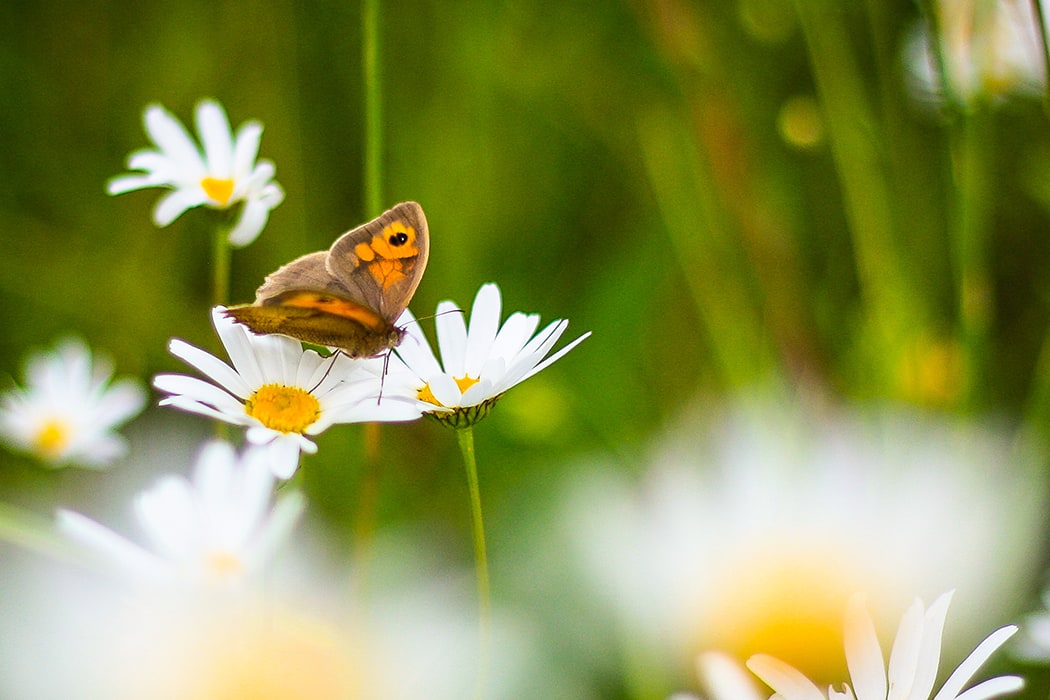 A UK native butterfly feeding on a large wild dasies