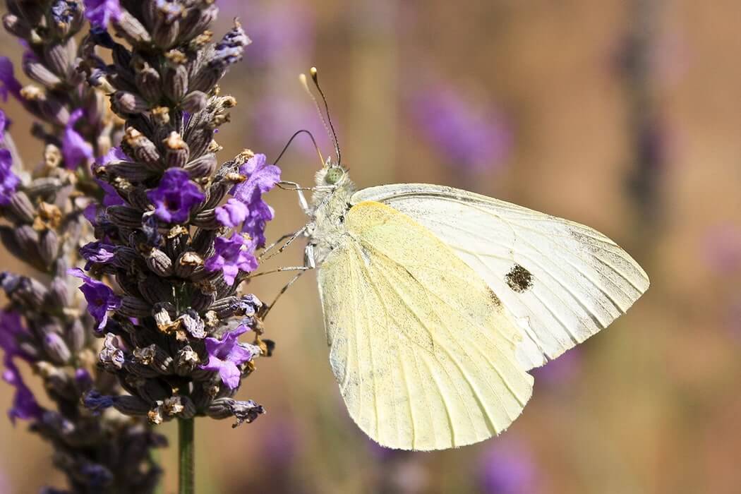 A large white butterfly feeding on some summer Lavender.